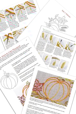 Festive Fall offers three autumn embroidery designs featuring a pumpkin, leaves, and wheat in a small, medium, and larger version, so that you can choose whatever level of complexity you wish to stitch.