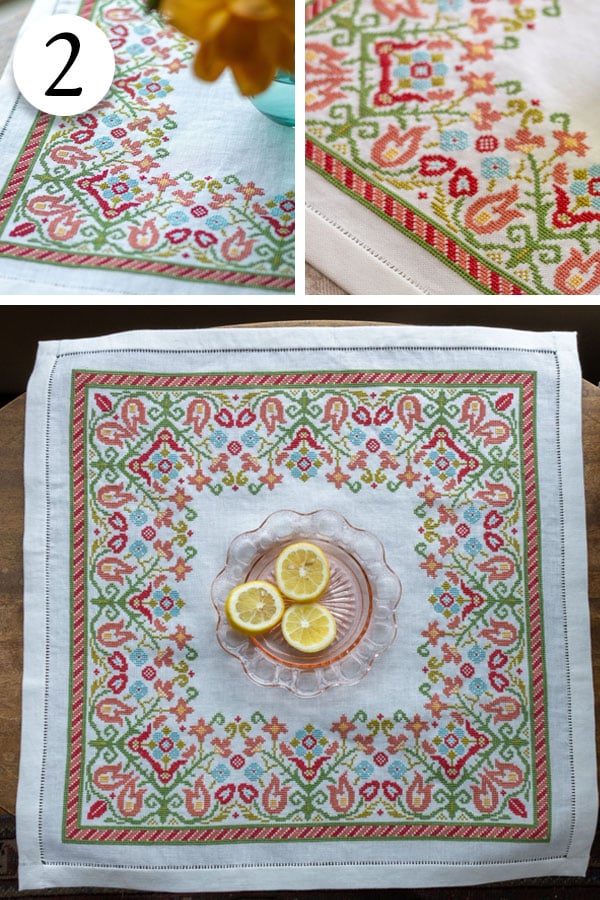 3. Santorini Flora - large square 19.5" x 19.5"; 30 ct European linen in vanilla (soft white); DMC thread; needle; chart