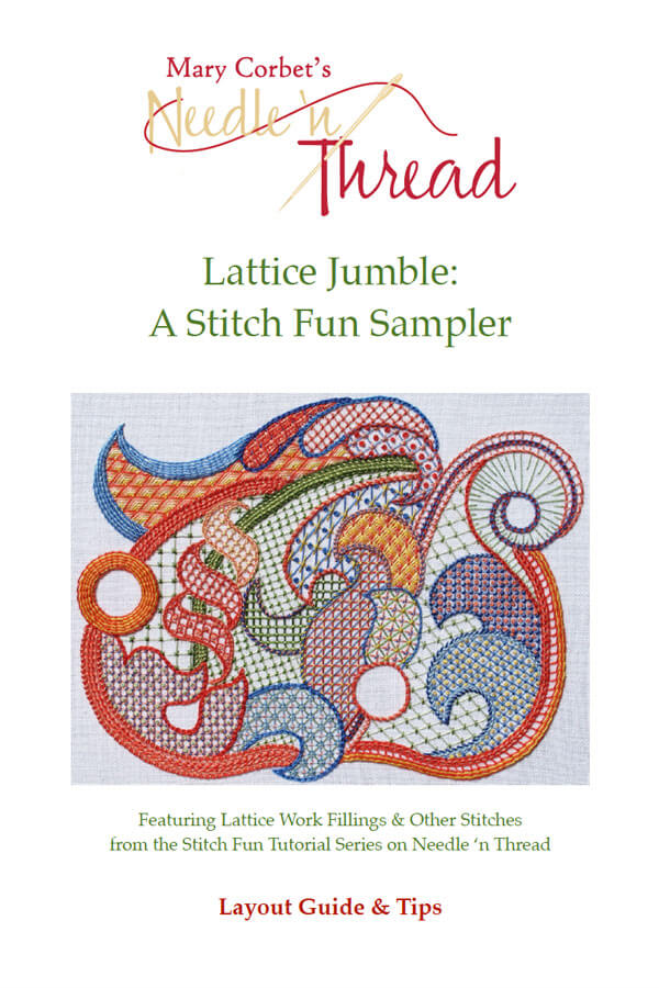 The Lattice Sampler Guide includes the sampler pattern, materials used, tips and stitching techniques, a stitch index, and detailed section layouts of all the stitches used in every element on the Lattice Jumble Sampler. The guide is 41 pages long and includes 125 photos and diagrams to help you complete your own sampler. The photos are full color and close up, so you can really see the details!