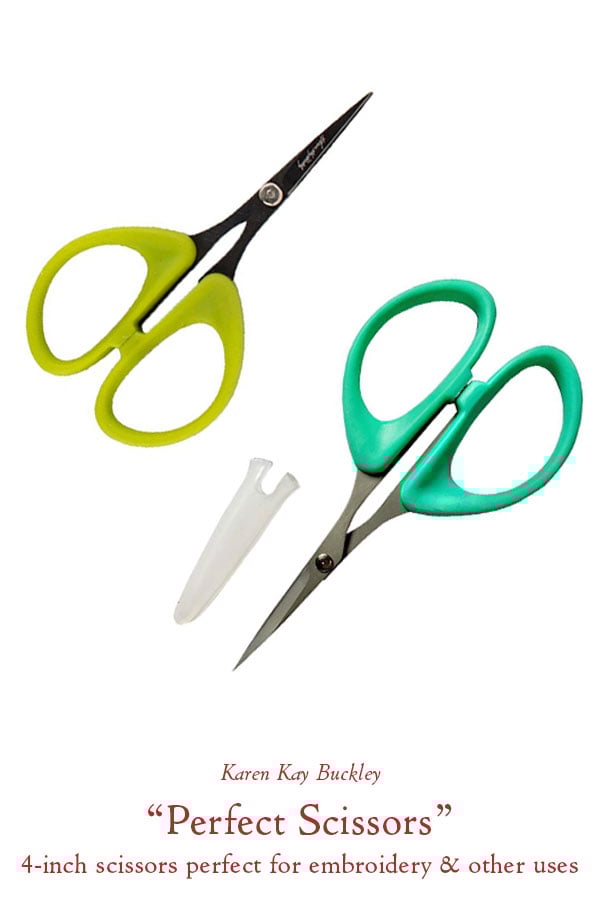 The green scissors feature a stainless steel micro-serrated blade. I use these scissors for goldwork, to cut real metal threads. I also use them (a second pair) for trimming small hexies and other small pieces of fabric on finish work. They work wonderfully with various types of fabric. They also work great for cutting embroidery thread!